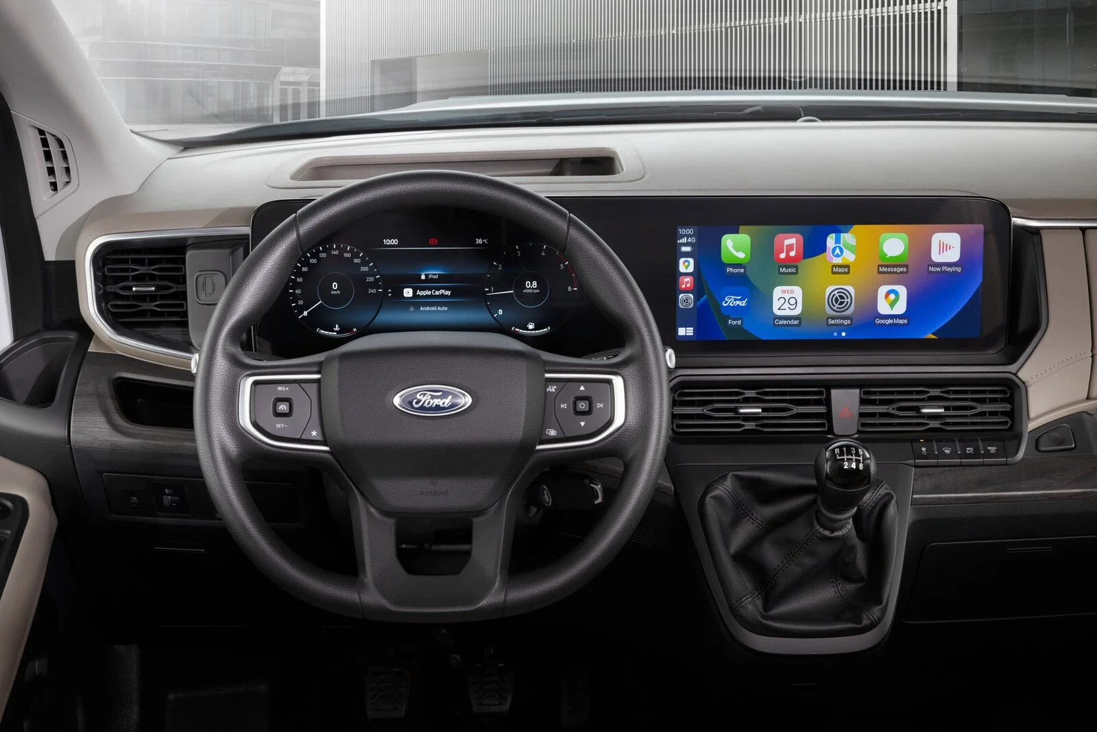 Nội thất của Transit thế hệ mới tập trung sự tiện nghi và công nghệ. Điểm nhấn khoang lái với cặp màn hình 8 inch. Một cho bảng đồng hồ sau vô-lăng và một cho thông tin giải trí.