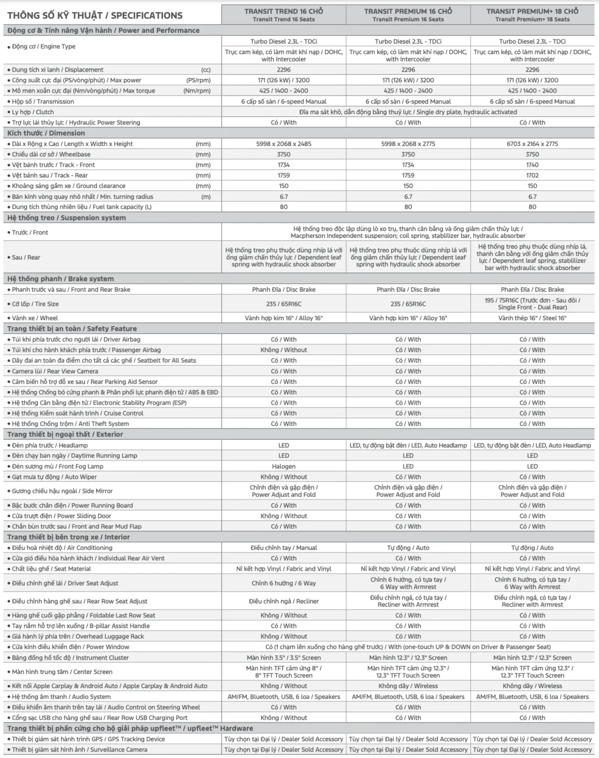 | Ford Transit Premium+ 18 chỗ | 1.087.000.000 VND |